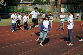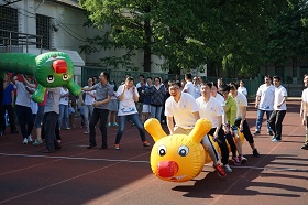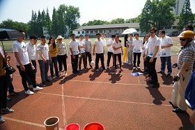 此次运动会,共有4个活动项目:接力跳长绳、足球保龄球、投沙袋、毛毛虫竞速。尽管烈日炎炎,但教职工们依然兴致盎然,争分夺秒练习比赛项目,认真进行热身等赛前准备。在足球保龄球、投沙袋项目大家玩得不亦乐乎,而接力跳长绳、毛毛虫竞速项目的比赛则异常激烈,参赛职工一个个精神抖擞,队友们在旁加油鼓劲,场面十分热闹。
