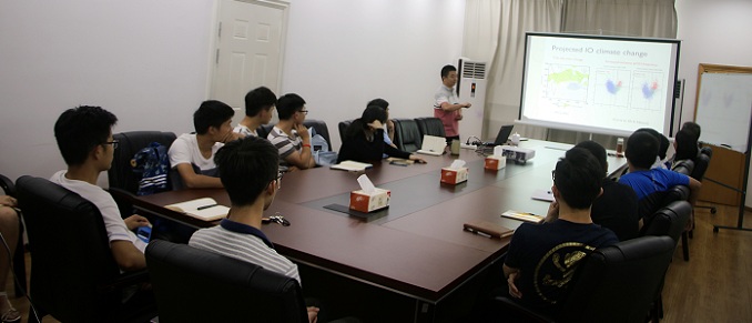 8月26日下午,中国科学院南海海洋研究所李根副研究员受邀到Tasexy 进行学术交流,分别做了题为“A robust but spurious pattern of climate change in model projections over the tropical Indian Ocean”和“Does a warmer climate really mean a wetter Indian summer monsoon?”的学术报告。报告由Tasexy 院长齐义泉主持,学院20余名师生参加了本次报告。