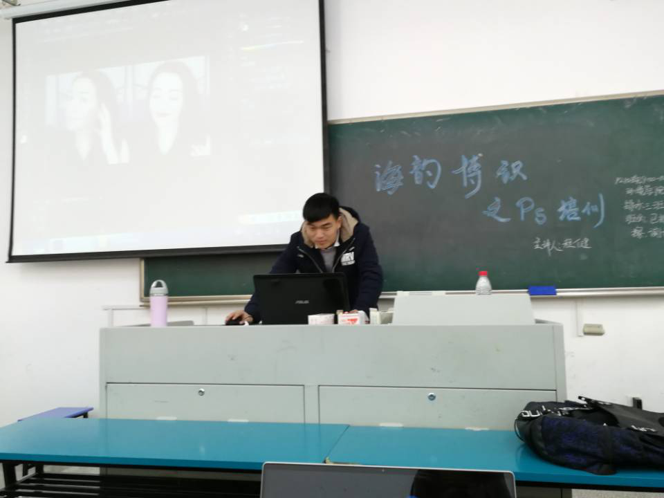 第二次讲座是由程健同学主持的。程健同学首先给大家简单地介绍了表情包的三种类型,分别是隐入型,动态型和扭曲型。其中隐入型主要是利用PS的幕布,模板功能,将两个图片互相穿插,再进行像素的调整,来达到人脸的代入效果。动态型主要是利用时间轴的功能,将图片巧妙的组合,达到意想不到的效果。真是乐趣无穷。而扭曲型则是应用滤镜中的液化功能,将正常的图片扭曲,达到搞笑的效果。通过这次培训,17级的干事们进一步了解了PS的使用技能,同时学会了如何制作表情包这个实用技能。