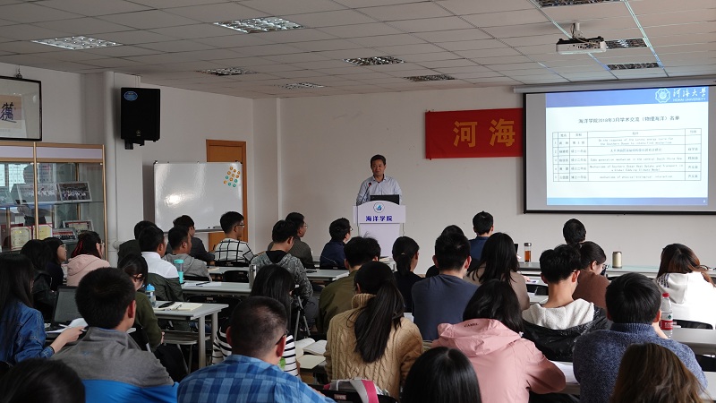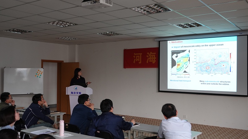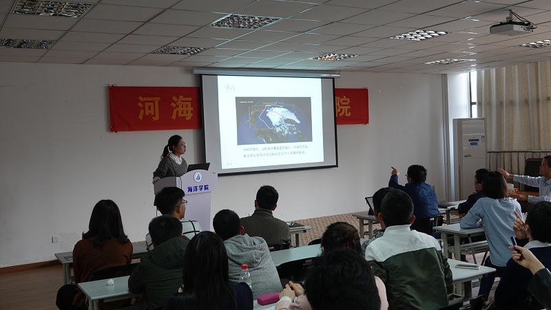 杨雅煜同学以北极太平洋扇区温盐结构变化的初步研究”为题,阐述了北极海冰减少以后,楚科奇海域水团发生的显著变化及太平洋冬季水的年际变化等问题。陈佳佳同学以“Eddy generation mechanism in the central South China Sea”为题,利用卫星高度计的海面高度异常数据和非线性一层半约化重力模式,汇报了南海中部中尺度涡生成机制的研究进展。