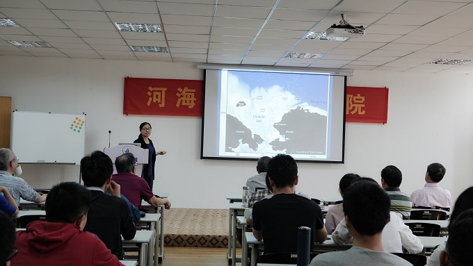 4月3日上午,广东海洋大学李敏博士作了题为“Circulation of the Chukchi shelfbreak and slope from moored timeseries”的学术报告,基于定点浮标观测数据,她重点介绍了楚科奇海北部陆坡区域环流结构以及水体输运情况。报告结束后,中国海洋大学刘秦玉教授还与参会师生进行了讨论与交流,为师生们答疑解惑。