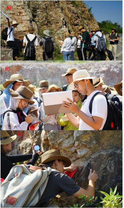图4、野外教学A)、B)。C)练习罗盘测量地层产状。