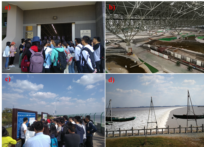 a)和b)六堡试验基地参观;c)老盐仓听取钱塘江大潮形成原因的讲解;d)现场观看老盐仓一线潮