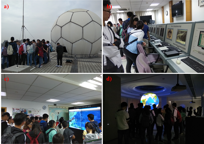 a)听取浙江省海洋观测网的讲解;b)和c)参观海况预报演播室;d)听取预报中心构成及业务介绍