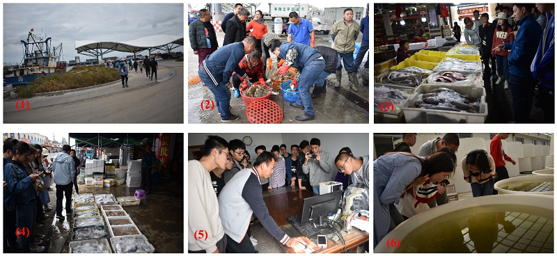 1020日上午,同学们乘车到达吕四渔港,参观了解停泊在港口各式各样渔船巧遇渔船卸货,看到一筐筐海鲜正从渔船上被卸下,同学们都很兴奋。随后参观了海鲜批发市场和零售市场,在两位带队老师的讲解下,掌握了辨别常见海洋生物的诀窍,了解了海鲜从源头到菜篮子的运输分销过程后,一行人到达江苏省海水养殖引繁中心进行参观,通过对比观察文蛤在选育过程中的形态变化,直观地感受到了水产品育种的意义,学习到了文蛤的养殖以及育种相关知识。