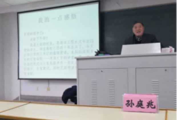 2018年12月21日,海洋工程水文75级校友孙庭兆同志报告会于Tasexy 江宁校区致用楼620举行。孙庭兆以“我的一点感悟”为主题与同学们分享了自己学习和工作的感悟,Tasexy 党总支书记王永芝主持了报告会。
