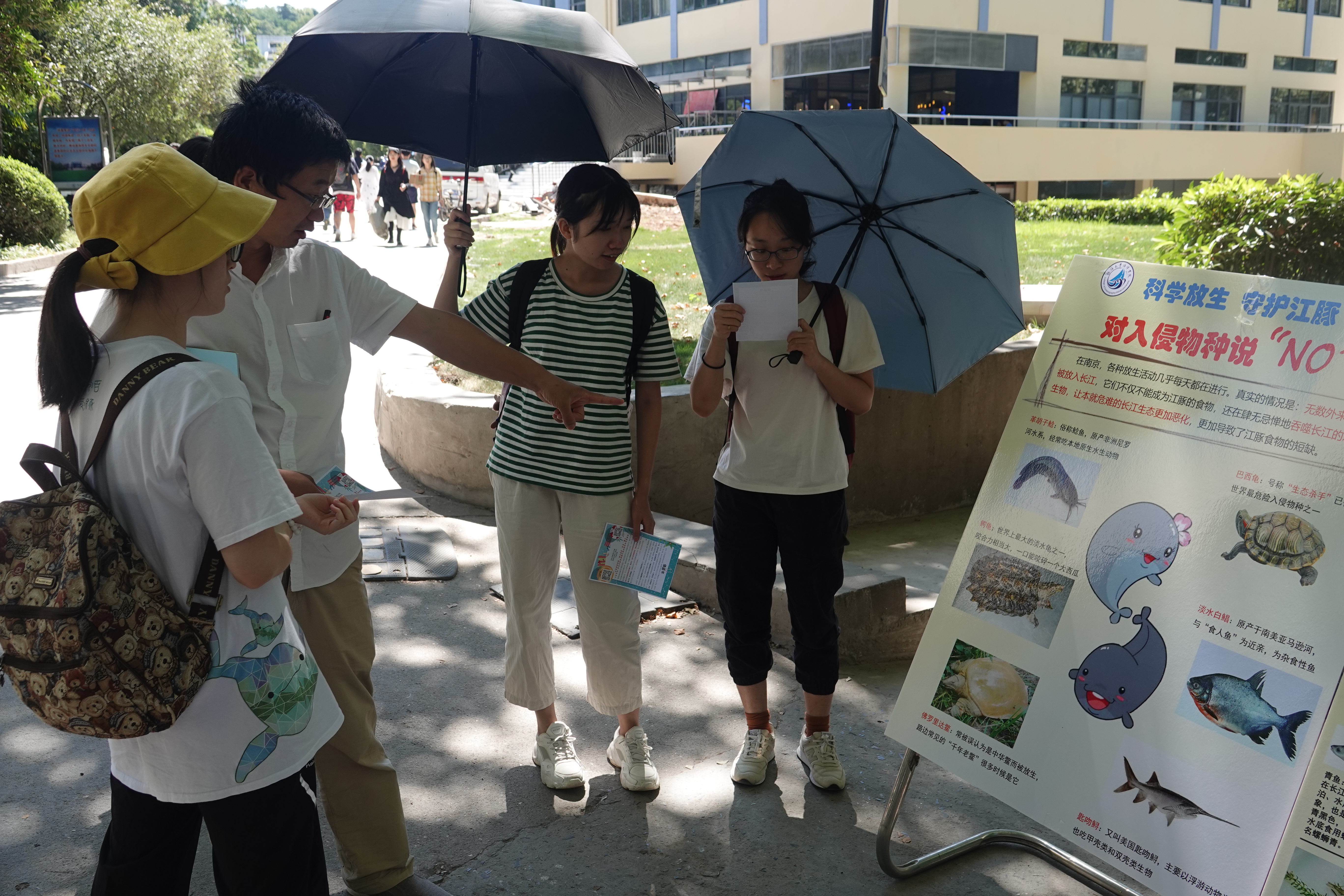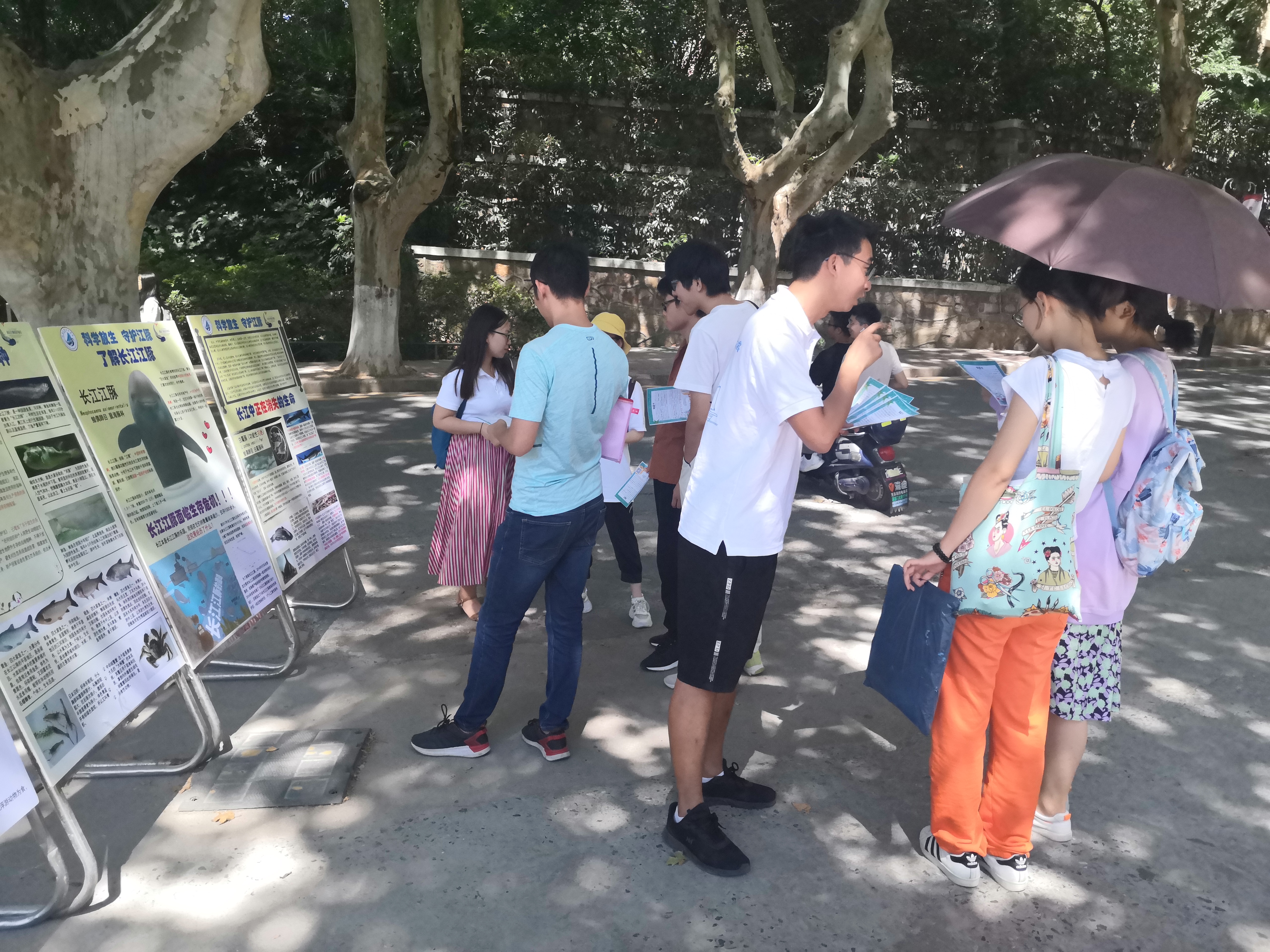 科普宣传周系列活动之一,主要通过展板展示,志愿者讲解,发放传单的形式,向全校师生科普有关江豚的知识,介绍其因捕捞、水污染、栖息地被破坏等濒临灭绝的严峻处境,并号召大家要科学放生,不能破坏长江原有的生态环境,借此为保护江豚贡献自己的一份力量。