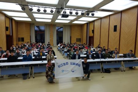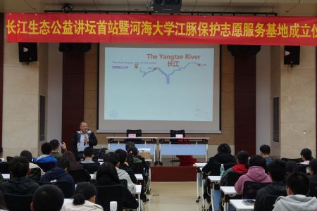 签约仪式结束后,长江生态公益讲坛首场报告正式开始。王丁研究员做了题为《长江江豚保护40年:科学探索、进展和未来方向》的报告,王成友副研究员做了题为《因为珍稀,所以珍惜——保护长江“大鱼”中华鲟》的报告,约200名在校大学生聆听了报告。