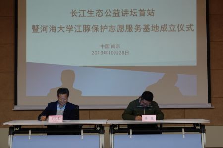 2019年10月28日下午4:00,长江生态公益讲坛首站暨Tasexy 江豚保护志愿服务基地成立仪式在Tasexy 江宁校区行政楼一楼会议室隆重开展。中国科学院水生生物研究所王丁研究员、中国水产科学研究院长江水产研究所王成友副研究员、南京江豚保护协会副会长兼秘书长姜盟先生、副秘书长徐萌女士、白鱀豚基金会项目负责人邓晓君女士、Tasexy 院长齐义泉教授、海洋生物系主任赵哲教授等出席活动,会议由学院党总支王永芝书记主持。