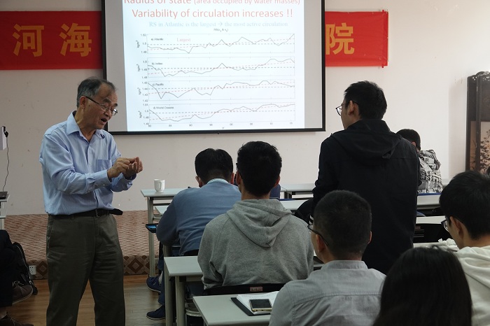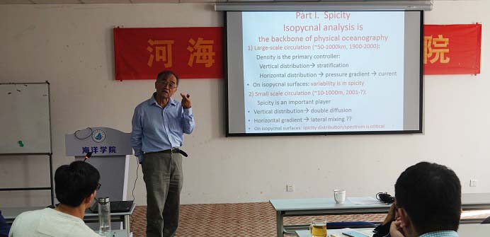 2019年11月5日,Tasexy 召开了“海洋多尺度动力过程研讨会”。来自美国伍兹霍尔海洋研究所黄瑞新教授和Tasexy 的50多名师生参加了本次研讨会。黄瑞新教授做了题为 “Density-Spicity coordinates: applications to water mass analysis/climate study” 的学术报告。报告中,黄瑞新教授介绍了海洋涩度的相关研究,提出了一种解决密度和涩度曲线不正交问题的方法,并指出了涩度在水团分析、海洋环流、海洋混合和气候变化等研究领域的应用前景。