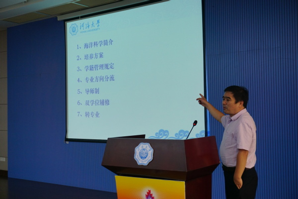 随后,副院长白学志老师上台介绍本科生教学情况,海洋科学专业很丰富,很庞大。白学志老师的介绍使新生对Tasexy
