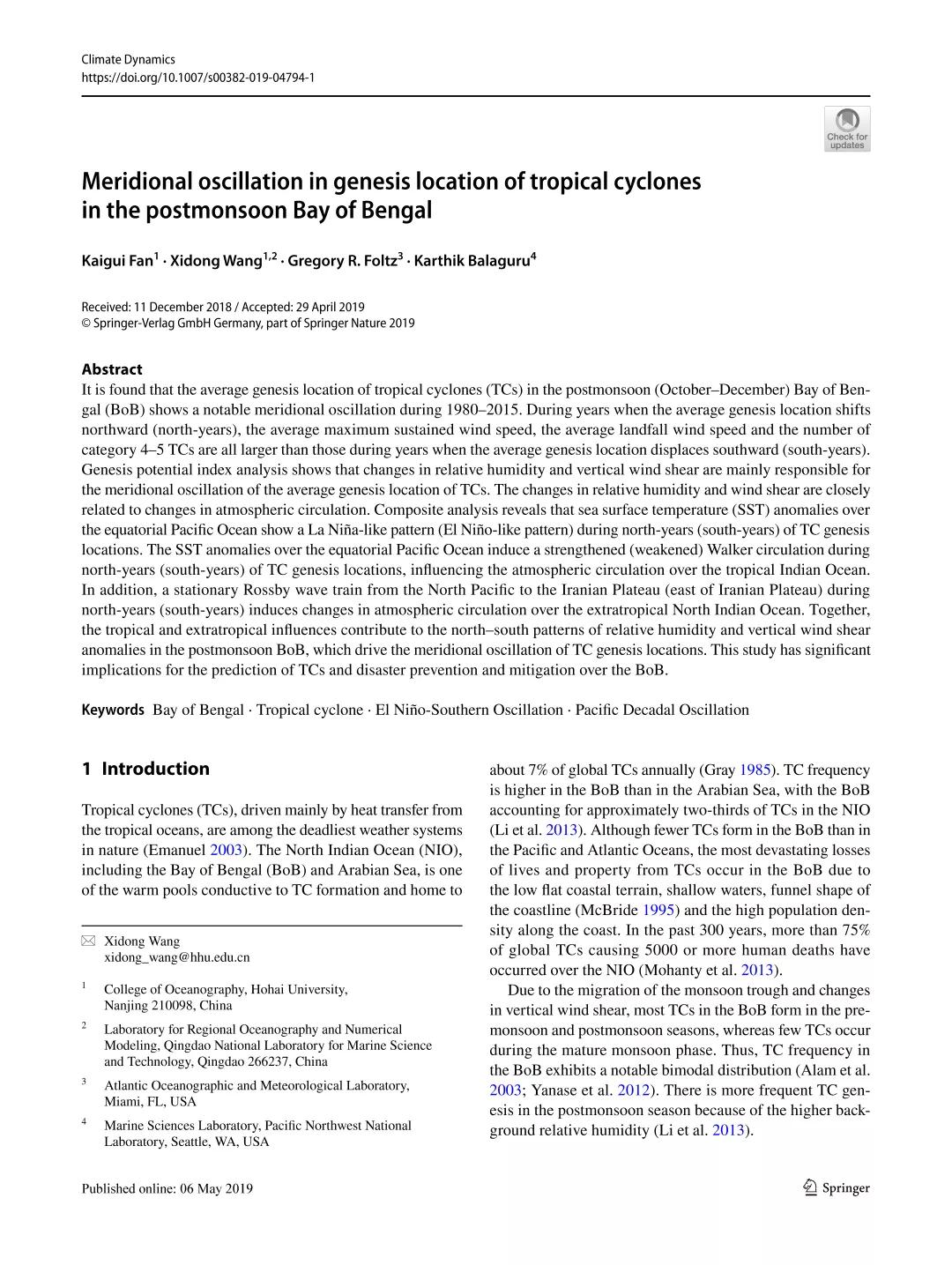2、Kaigui Fan, Xidong Wang, Gregory Foltz, Karthik Balaguru (2019). Meridional oscillationin genesis location of tropical cyclones in the postmonsoon Bay of Bengal. Climate Dynamics, 53, 2103-2118. //doi.org/10.1007/s00382-019-04794-1.