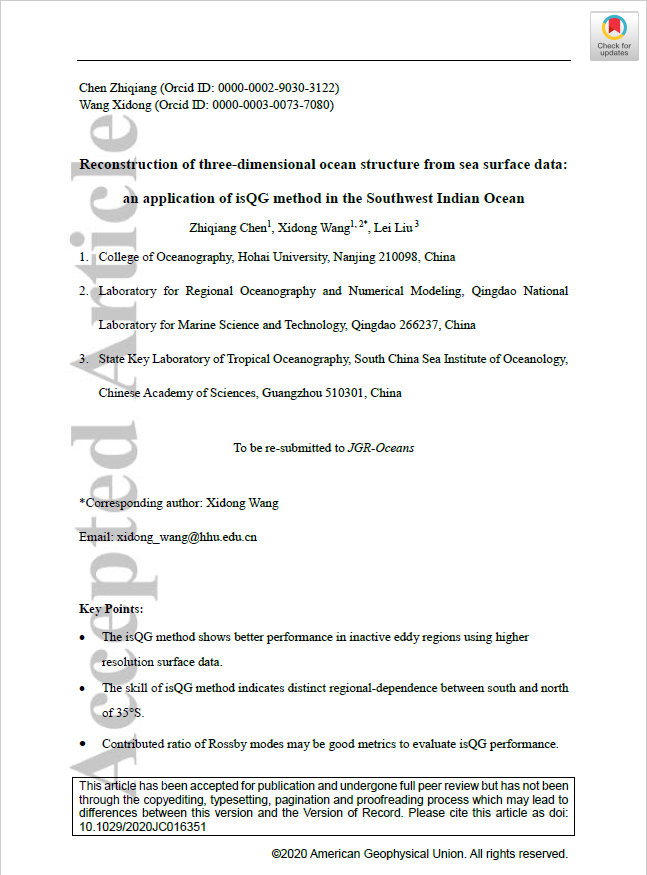 5、Zhiqiang Chen, Xidong Wang, Lei Liu (2020). Reconstruction of three-dimensional ocean structure from sea surface data: an application of isQG method in the Southwest Indian Ocean. Journal of Geophysical Research: Oceans. //doi. org/10.1029/2020JC016351.