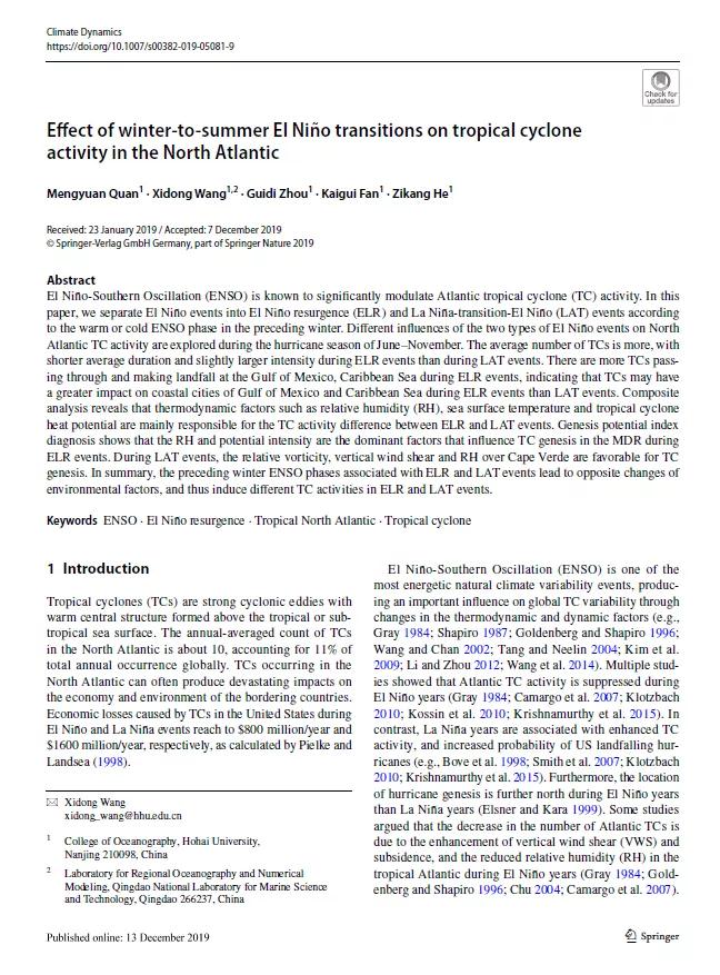 1、Mengyuan Quan, Xidong Wang, Guidi Zhou, Kaigui Fan, Zikang He (2019). Effect of winter-to-summer El Niño transitions on tropical cyclone activity in the North Atlantic. Climate Dynamics, 54(7051):1-16. //doi.org/10.1007/s00382-019-05081-9.
