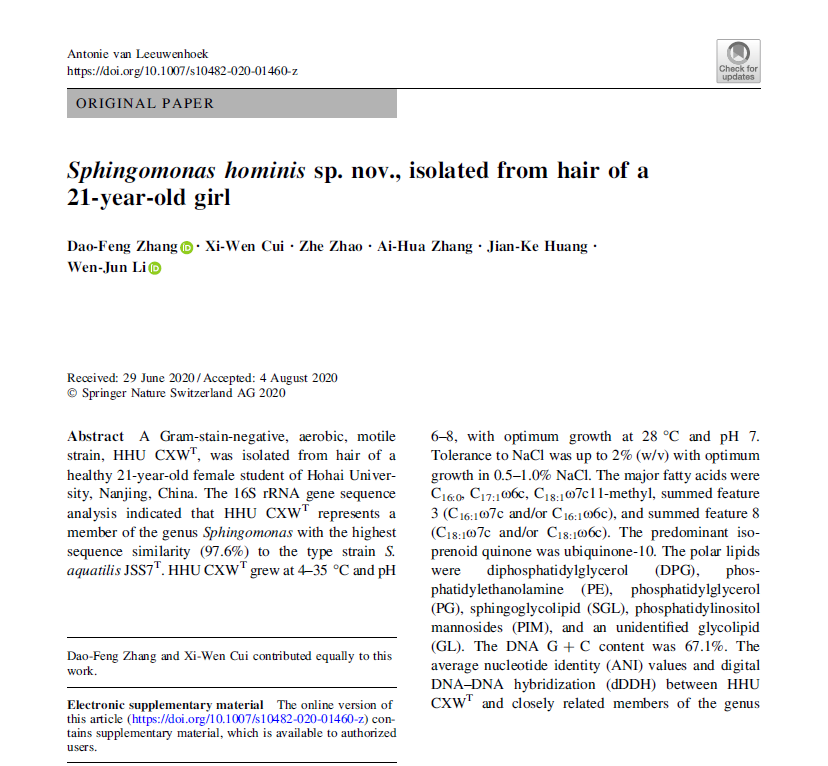 近日,Tasexy 海洋生物系张道锋博士和2016级本科生崔希雯同学为共同第一作者在SCI收录源刊、以显微镜发明者列文虎克命名的国际微生物学期刊《Antonie van Leeuwenhoek》在线发表了题为“Sphingomonas hominis sp. nov., isolated from hair of a 21-year-old girl”的文章(//link.springer.com/article/10.1007/s10482-020-01460-z)。
