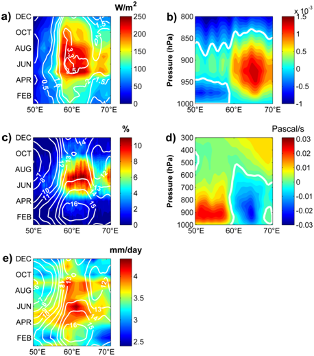 图2区域B的43°S纬向断面上的(a)海气温差SST-SAT(℃,白色等值线)和海气通量(QS+QL)的年循环;(b)南半球冬季的垂向动量交换(单位:m/s2),本文中垂向动量交换由公式<!--[if !msEquation]--><!--[endif]-->计算;(c)大风频率的年循环(单位:%);(d)南半球冬季垂向风速的气候态平均,即上升运动(单位:Pascal/s,向下为正);(e)降雨的年循环(单位:mm/day);(c)和(e)中的白线是OISST的SST年平均等值线,(b)和(d)中的白线是各自的零等值线。