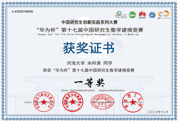 近日,Tasexy 宋梓庚博士(队友:王宁、陆燕清,指导老师:丁根宏老师)在第十七届“华为杯”数学建模竞赛获得一等奖(获奖率约为1.3%)。