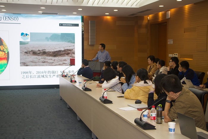 下午的学术研讨会由Tasexy 的王强教授主持。中国气象科学研究院的任宏利研究员应邀作《ENSO多样性研究进展》报告,介绍了ENSO的空间和时间多样性,并利用新的经验方法,揭示了新型ENSO事件在近40年来频发的原因;中国气象局地球系统数值预报中心的苏京志研究员应邀作《副热带太平洋海温对ENSO形成演变的调制作用》报告,从业务预报角度,介绍了两种对ENSO发生、发展具有重要影响的副热带太平洋经向模态,以及两种模态在ENSO业务预报中的重要作用。两位专家精彩的报告令在场师生受益匪浅。本次会议在热烈的研讨氛围中落下帷幕。