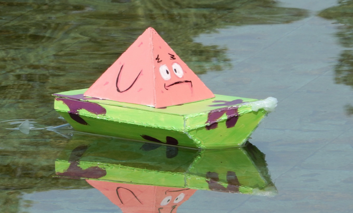 设计理念:该船命名为海星号,以派大星为设计主题,希望通过以此配色,带大家回忆起童年是比奇堡带给我们的欢乐。船体设计为单体尖底以便减小空气阻力和水带来的阻力,加快船在水中的航行速度。船内采用分仓设计,减小万一船部分漏水带给船的危害,减小沉船的几率。上半部分设计为尖头希望也能减小空气阻力,速度更快。上半部分下半部分可以分开,以便承重。
