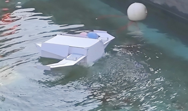 设计理念:本船整体采用单体流线型结构,以船速快、稳定性高、核载量大为主要目的,初赛直道竞速的结果也能证明该结构有一定优越性。船头部大体呈三方单锥形,前尖后平。底部由四张板拼接而成,呈尖角状。内部仓板上侧装有电路板和发动装置,后部装有螺旋桨外套。外部船体颜色以红黄蓝为主色,灵感来源于三原色及三色鱼。