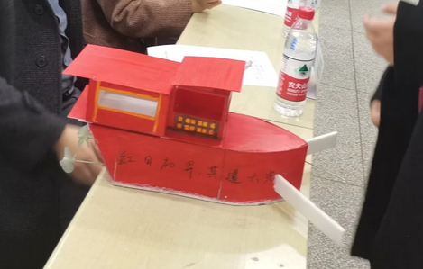 设计理念:在建党一百年之际,上部分船体以南湖红船为原型。船首采用微带曲线前倾型设计,在发生碰撞时船体水线以下部分不易受损,外观上比较简洁,有快速感。采用方形尾设计,使尾部水流能较平坦地离开船体, 减少航行阻力。采用板块化设计,便于安装,拆卸与维修,且装饰物可按需取下。船内设有隔水舱,防止渗漏,保护动力装置。船底,船内设有加强梁,模型稳定。船侧带有稳定翼,航行较为平稳。