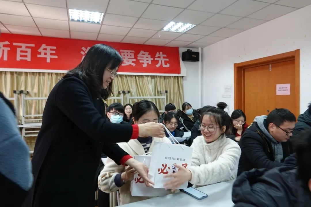 最后,由各位老师们亲手向考研同学分发学院精心准备的考研礼包。以“逢考必过”小礼袋,包含了心想事“橙”和暖心手宝,为在寒冬里备战的同学们带来热火般温暖与昂扬拼搏的力量!