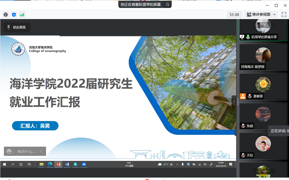 院党委副书记吴昊从就业形势、2022届就业基本情况和存在困难等方面进行了交流。吴书记表示,学院会积极搭建平台,提供就业指导和精准帮扶,也期望导师们提供支持,形成合力,共同做好研究生就业工作。