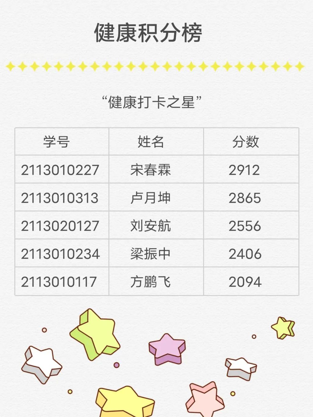 此次健康微积分打卡活动历时113天(2021.11.1-2022.2.21),涌现出了许多坚持每日健康打卡累计积分较多的同学,以此列出榜单对他们提出表扬。