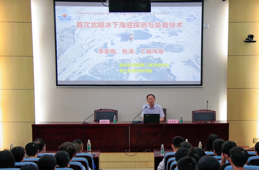此次访问期间,李家彪院士还在听取了宋翔洲院长关于Tasexy 的发展现状和未来规划介绍,参观了我校海洋科学实验中心和校史馆,并且做了“院士讲坛”——“首次北极冰下海底探测:挑战与进展”的学术讲座。李院士介绍了中国科学家在北极冰下海底探测上取得的重大进展,包括国际上首次开展北极加克洋中脊常年冰封区的大规模海底地震和大地电磁探测,以及首次完成加克洋中脊东段的海底热液调查所取得的重要发现,并表示了对于Tasexy 参与极地海底探测的期待。报告结束前,与会师生积极与李院士进行了互动交流,Tasexy 等相关学院的200多名师生参加了报告会。