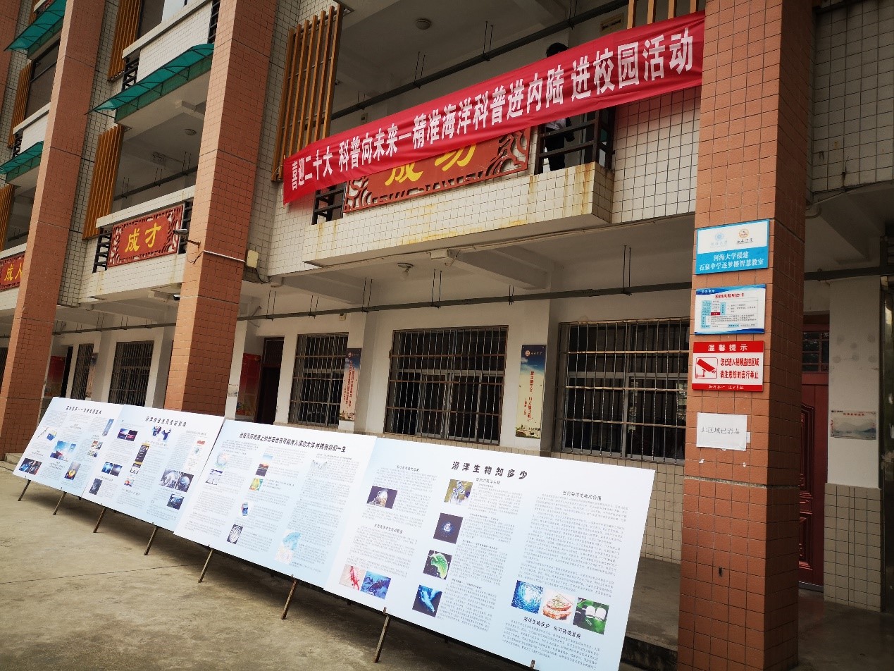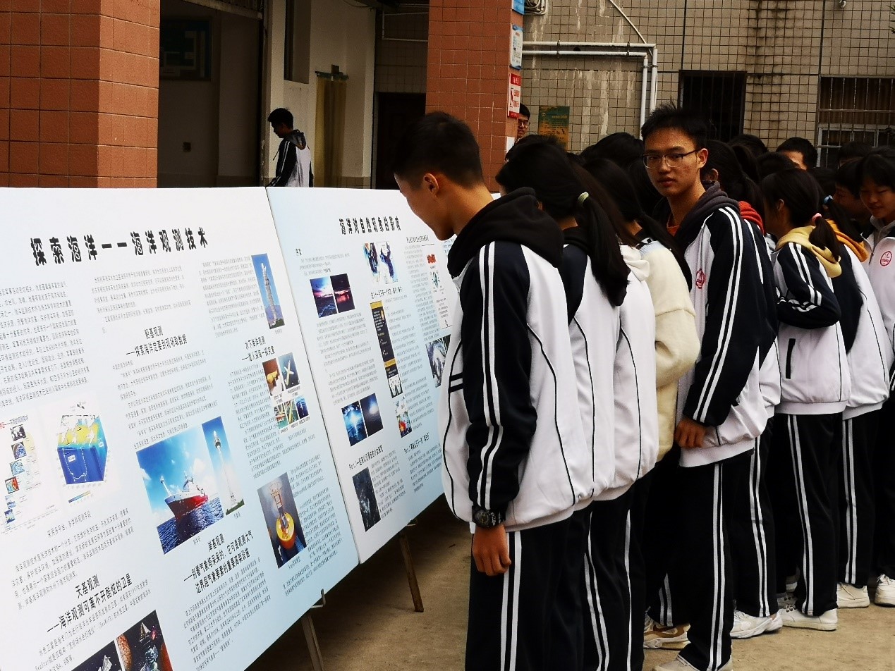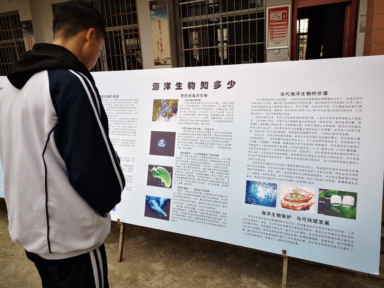 科普展共分为“迈进海洋”——岩石的地质经历展、 “跃动海洋”——海洋生物科普展、“走进蔚蓝”——海洋与气候、 “探索海洋”——海洋观测技术展4个展区,让海洋知识融入校园文化建设中,提高了学生们的科学素养,增强海洋意识,营造了良好的科普知识宣传氛围。