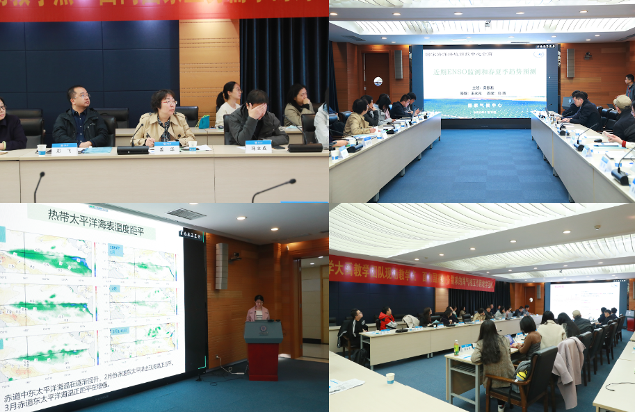 会议由国家海洋环境预报中心冯立成研究员和姜华首席预报员主持。与会专家主要围绕近期海洋和大气的监测状况以及ENSO动力、统计、人工智能模式的预测结果,对今年春夏季ENSO的发展趋势进行了深入探讨,并针对今年夏季我国各区域气温、降水、阶段性极端天气以及我国海区水温的预测情况进行了充分的讨论,最终形成了2023年春夏季厄尔尼诺及我国夏季汛期气候趋势的综合预测意见。相关预测结果请关注国家海洋环境预报中心公告。此次会商进一步深化了我校与预报中心的科教融合,为海洋气候预测理论与技术的发展提供了重要科技支撑。