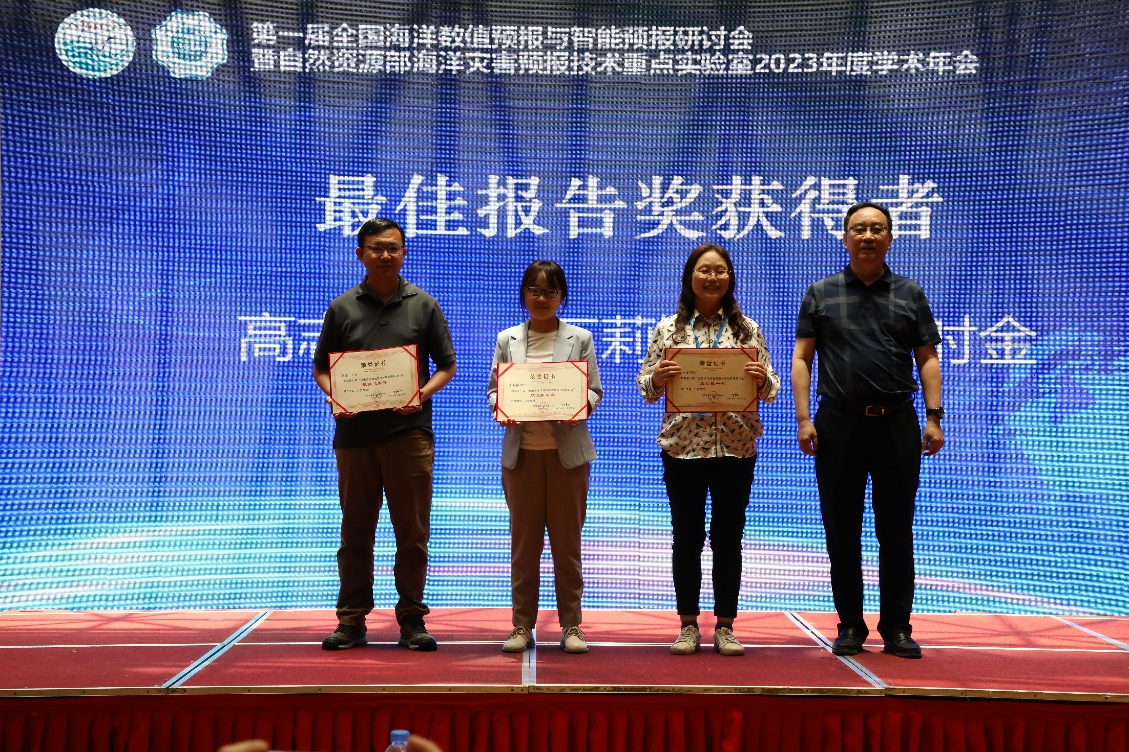 报告结束后,国家海洋环境预报中心战略部室主任夏冬冬简要介绍了《海洋预报》期刊,欢迎参会代表积极投稿。最后,会议举行了隆重的优秀报告奖和最佳报告奖颁奖仪式,共评出了最佳报告奖3人和优秀报告奖6人,于福江主任和邢建勇三级调研员分别为获奖者颁发了证书。