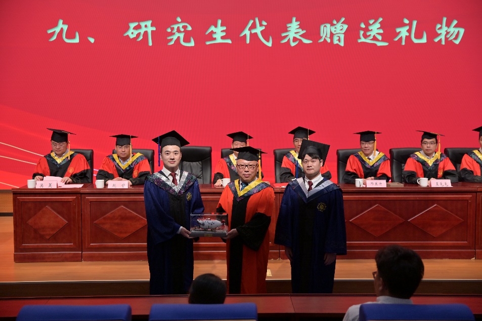研究生代表向学院赠送一艘深潜器“蛟龙号”的模型,代表了2023届海洋科学硕士班对学院的祝福,希望学院继续“进军深海大洋,探索学科前沿,服务海洋经济”。本科生代表向学院赠送院楼照片的拼图,背后是所有同学的签名,拼图留存了2023届本科毕业生专属的河海记忆,承载了每一位同学对学院美好的祝福,祝愿学院蓬勃发展,蒸蒸日上。党委书记胡忠华、院长宋翔洲为毕业生代表赠送学院精心定制的戒指并致以真挚的祝福,让祝愿与期盼一直陪伴毕业生走向未来征途,赠礼物后,学院领导代表与学生代表合影留念并互道感谢与离别。