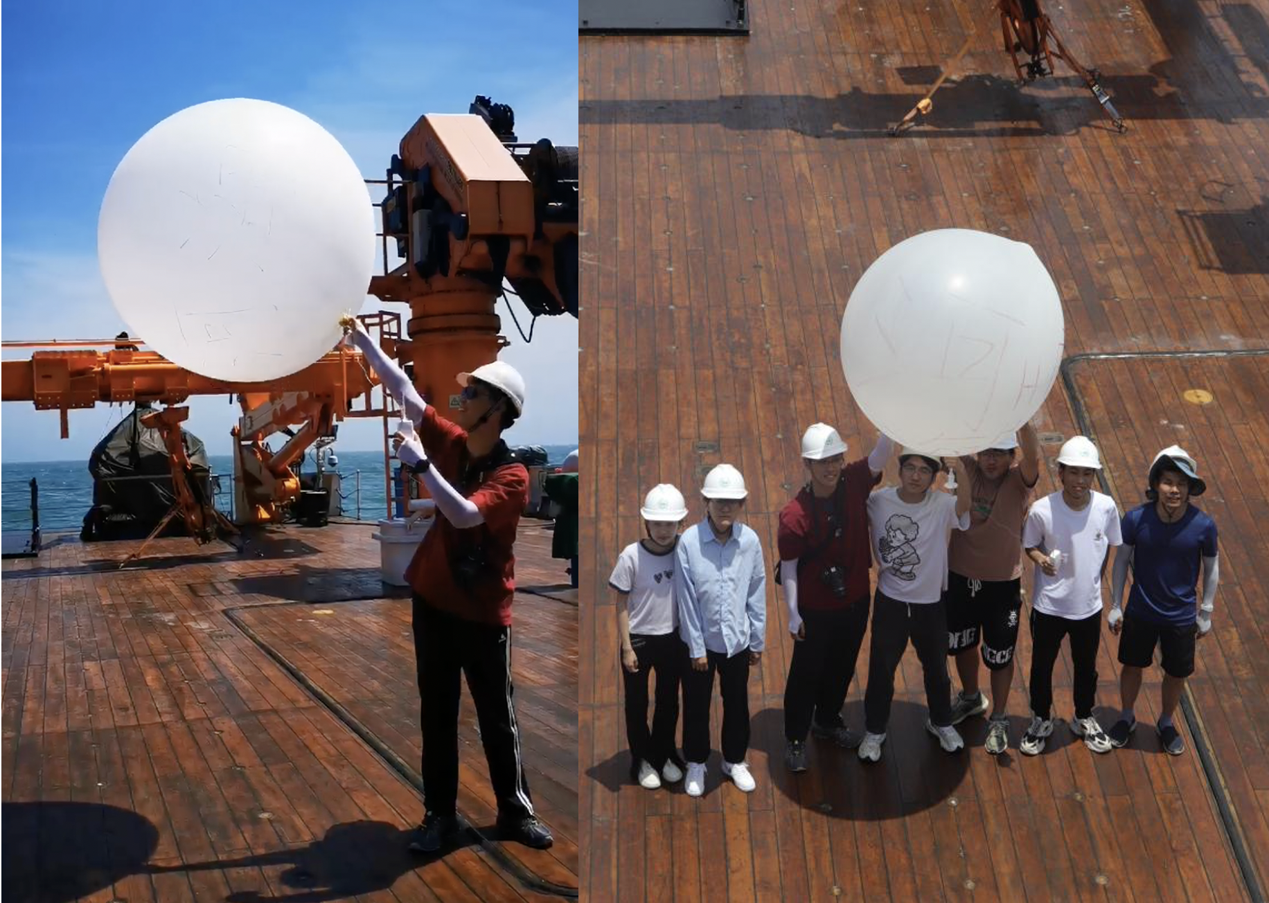 7月7号上午,“中山大学”号航行至台州沿岸海域站位,当天天气海况较差,遭遇了7级阵风,8级大浪,但Tasexy 六名学生经受住了大风大浪的考验,克服了晕船的不适,顺利完成了海洋气象观测实习内容。韩博副教授介绍探空仪器使用方式后,Tasexy 师生成功放飞探空气球,并在实验室实时读取传感器得到海上不同高度温度、气压、风速、空气湿度等海洋气象数据。随后在周海涛工程师的介绍下,了解学习了微波辐射计、激光风廓线雷达等气象观测仪器的使用及数据读取方式。在完成当天科考作业后,全体船员及参航师生进行了安全演习,熟悉了各项救生装置的使用及位置。