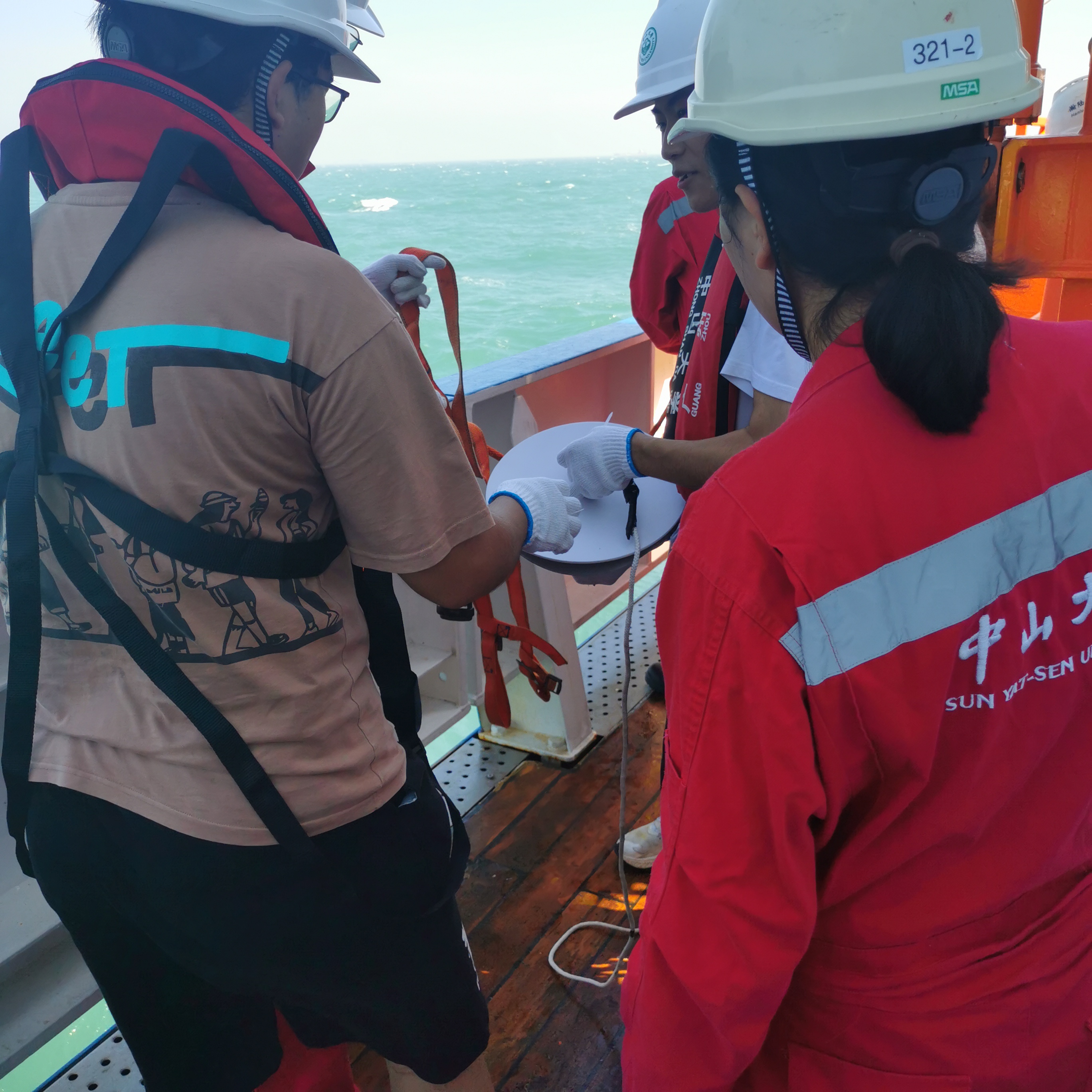 7月6日上午9点,Tasexy 师生在上海崇明岛由随船老师安排,有序地登上了“中山大学”号科考船。中山大学及相关单位高度重视本次海上科考实习,航行前董文杰(首席科学家)、于卫东(科考中心主任)、蓝明华(船长)、常越(领队)、崔廷伟(执行首席)等人为参航师生召开航次动员大会,介绍本次海上实习背景、注意事项等。下午,科考船在船员紧锣密鼓的安排下驶出停泊港口,船队三副为参航师生进行了系统的安全培训,随后探测部工作人员带领参航师生分组参观“中山大学”号各层设施、实验室和驾驶室并介绍船上相关仪器设备,让大家近距离感受到了“中山大学”号科考船的先进以及船上工作人员的热情。
