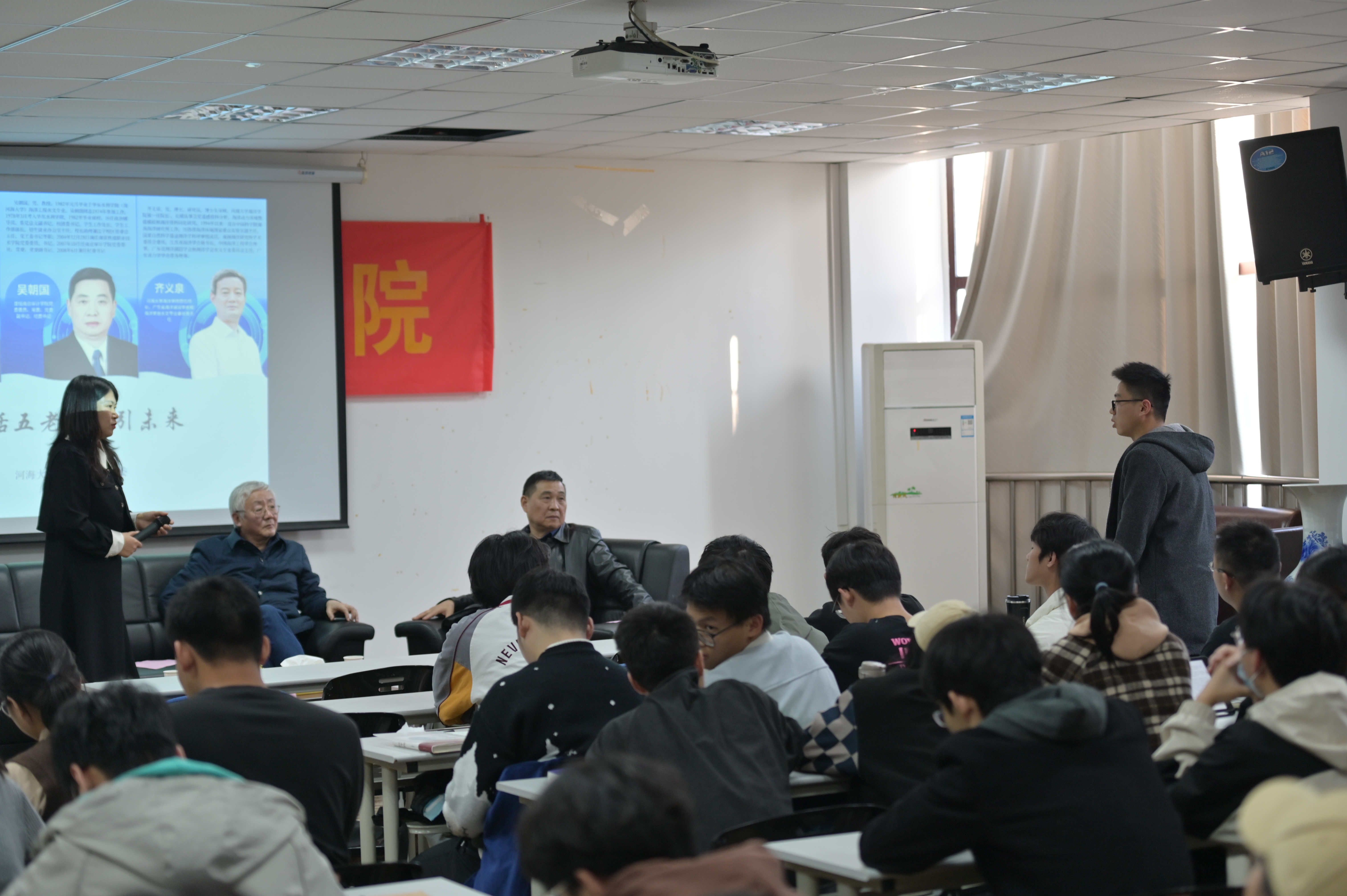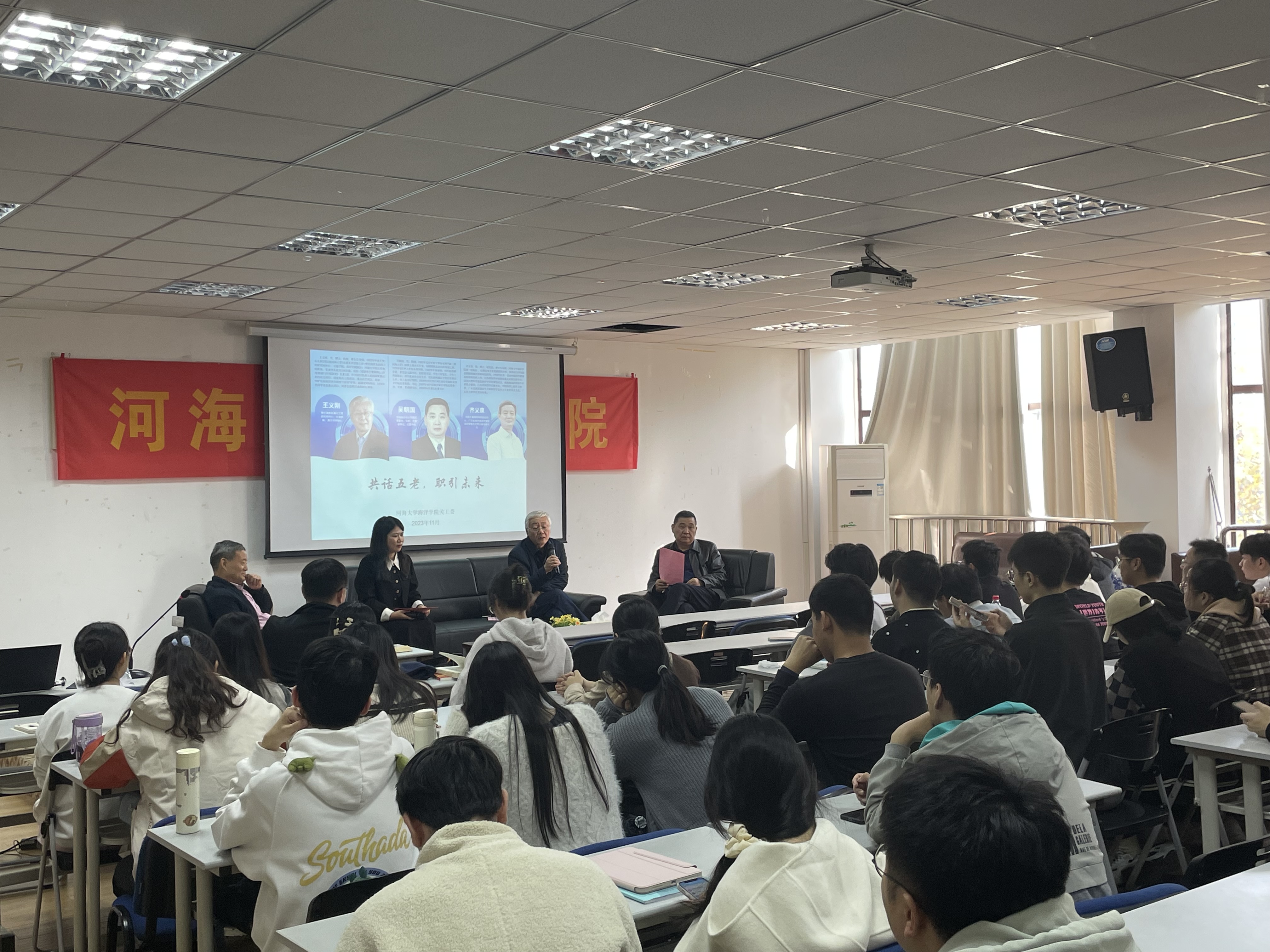 2023年11月21日,下午14:15,Tasexy “共话五老,职引未来”职业生涯访谈活动在西康路校区电气馆507成功举办。本次活动特邀海洋水文1982届校友吴朝国教授、1982届校友王义刚教授、Tasexy 首任院长1987届校友齐义泉教授三位嘉宾和同学们面对面交流,共话海洋人的职涯。
