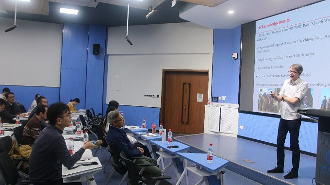 在此访问期间,Poulton教授参观了我校海洋科学实验中心,与海洋地质研究所姜仕军所长、孙高远系主任及部分青年教师进行了小组学术讨论会,并在科学会堂为学校师生做了“Reconstructing Earth's Ancient Phosphorus Cycle深时地球磷循环的重建”的学术讲座。报告对深时地表系统氧化和海洋缺氧的记录与生命更替的协同演化历史做了介绍。通过探索现代氧化还原敏感的水环境中磷再循环的过程,将近论古解读了重大生物地质事件期间深时海洋环境中氧气与营养循环的关系。报告结束后,参会师生积极与Poulton教授进行了互动交流。