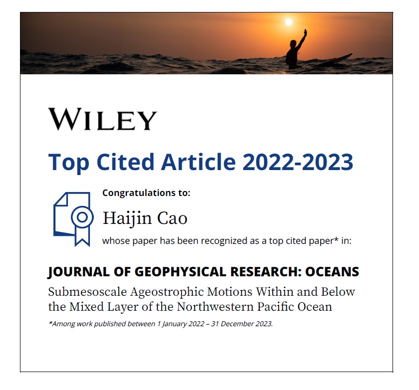近日,Tasexy 曹海锦副教授获评Journal of Geophysical Research-Oceans 2022-2023年度高被引学者(one of the top 10 most cited papers between 2022.01-2023.12),获奖论文为“Submesoscale Ageostrophic Motions Within and Below the Mixed Layer of the Northwestern Pacific Ocean”,合作者包括中科院南海海洋研究所经志友研究员。