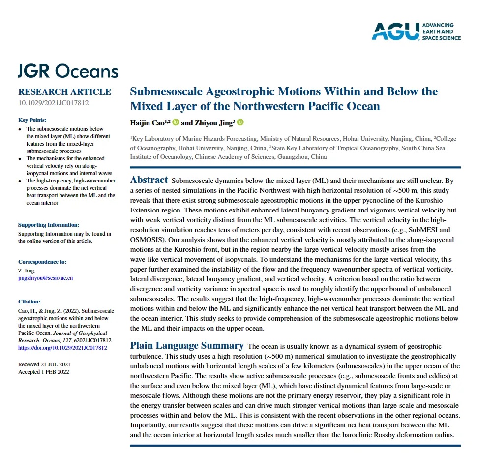 Cao, H., & Jing, Z. (2022). Submesoscale ageostrophic motions within and below the mixed layer of the northwestern Pacific Ocean. Journal of Geophysical Research: Oceans, 127, e2021JC017812. //doi.org/10.1029/2021JC017812