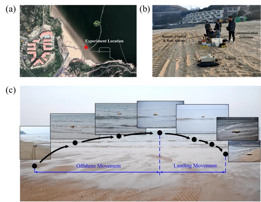 为验证系统设计的实用性,团队进行了系统性的实地测试,验证场景覆盖多种典型地形,包括沙地、碎石路面、草地、爬坡、越障等,展现了良好的地面通过性。此后,团队在连云港市大沙湾海域完成了自主离岸与登陆试验(图4),测试了该平台的水陆转换能力,充分体现了其环境适应性。
